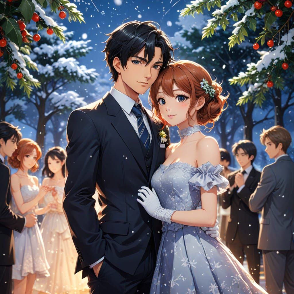 This image shows a detailed anime couple dressed for a New Years Eve party. Friends are visible in the background, with sparkling snow and holly completing the festive scene. Rendered in a vibrant anime art style.