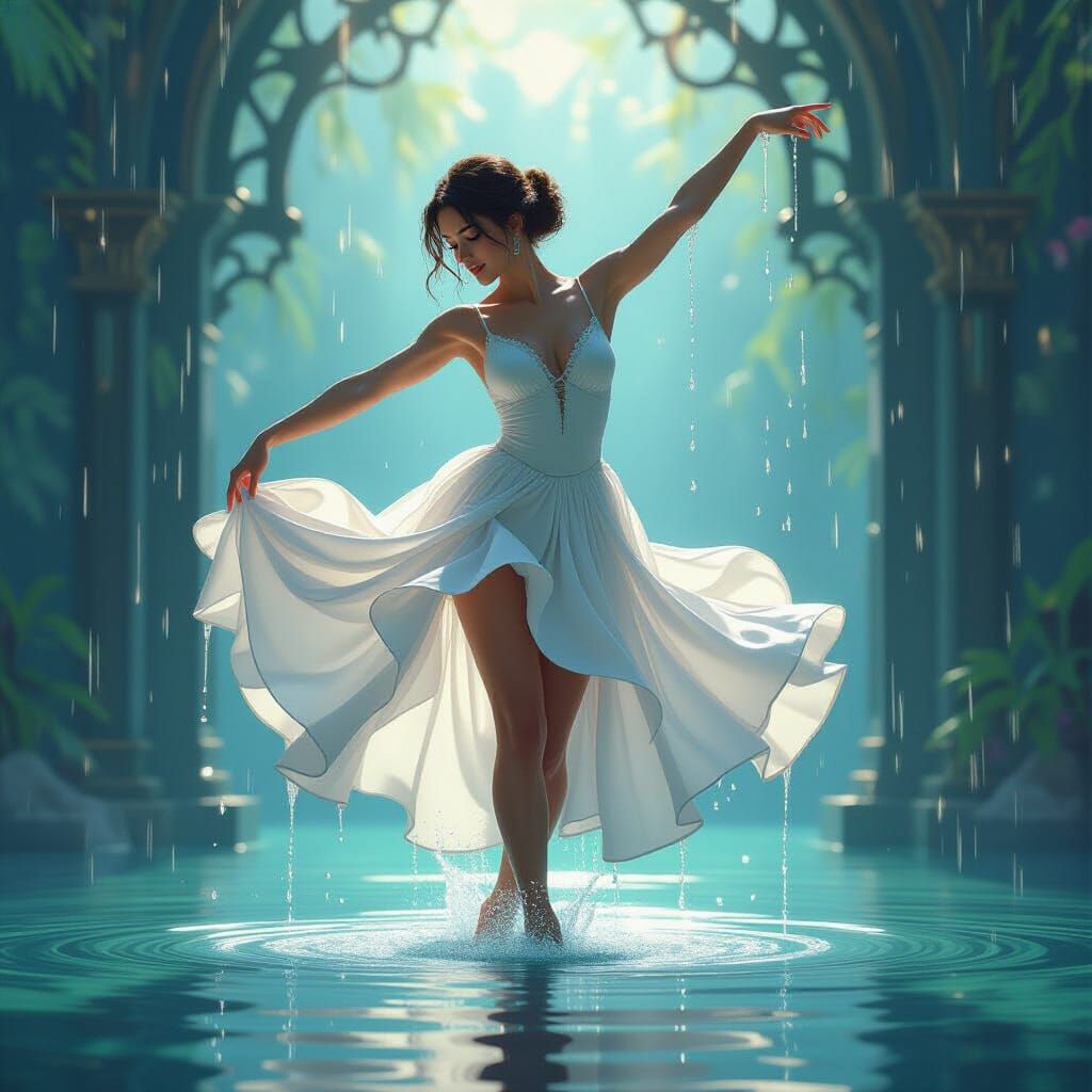 A concept art image of a balerina in a wet white dress dancing in water, featuring dynamic lighting and intricate details. Rendered with volumetric lighting in an 8k resolution.