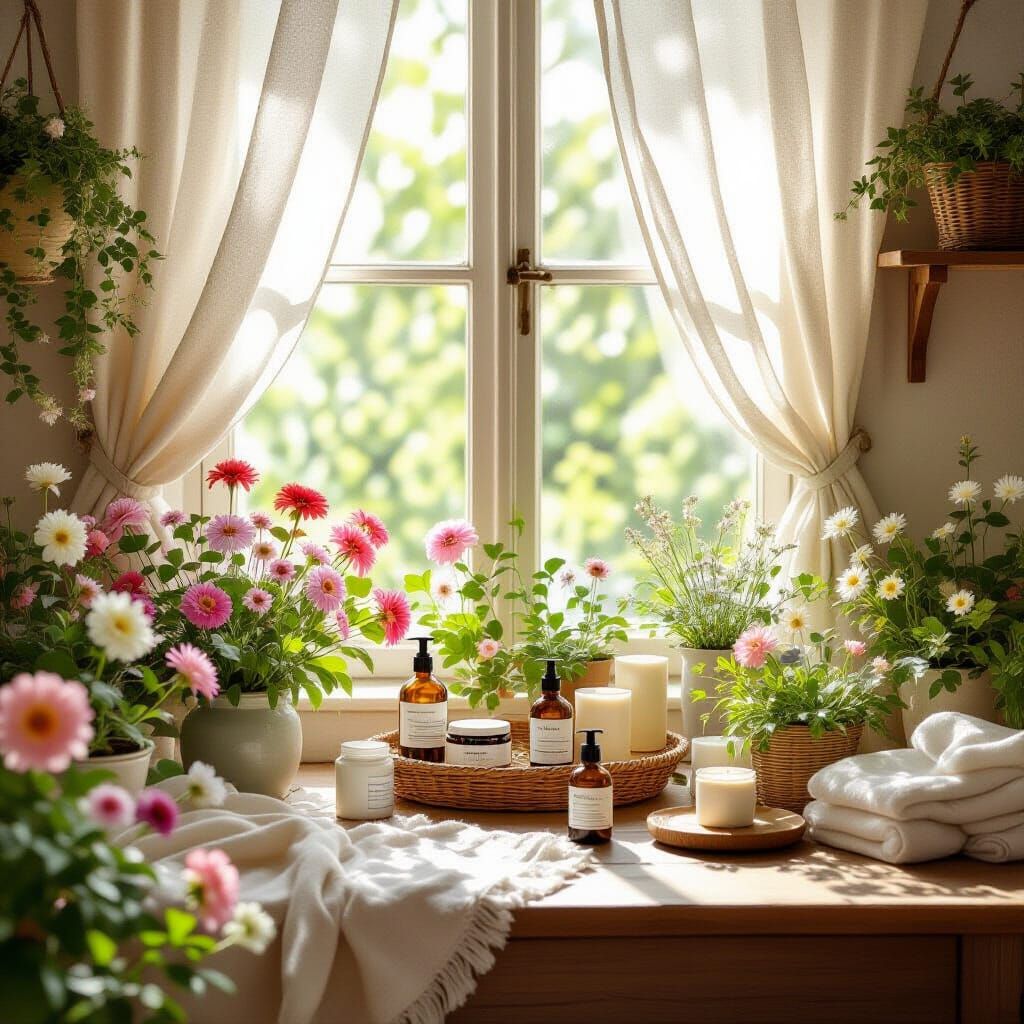 This image shows a sunlit skincare workshop filled with flowers and plants. The scene is reminiscent of an impressionist watercolor painting, with thick brushstrokes and layered impasto textures.