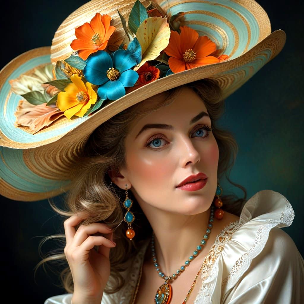 photorealistic full body portrait of charming happy lady wearing a grotesque enormous quirky eccentric hat, engaging amiable expression, fantastic surrealistic background, by Raphael, Francois Boucher, Francois Le Barbier, John William Waterhouse, Giovanni Bellini, Andrea Mantegna, Jacques Majorelle