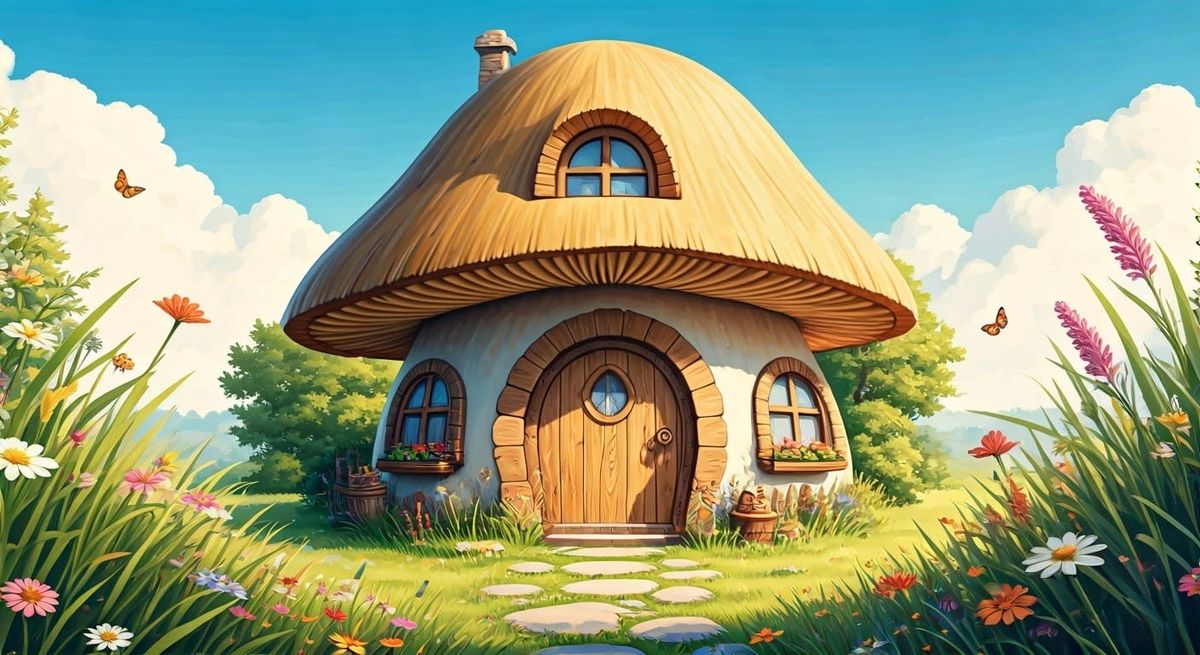 This charming image depicts a mushroom-shaped cottage with a thatched roof and intricate wooden door, set amidst a vibrant meadow filled with wildflowers and butterflies, under a clear blue sky with fluffy white clouds, evoking a warm and inviting atmosphere reminiscent of classic children's book illustr...