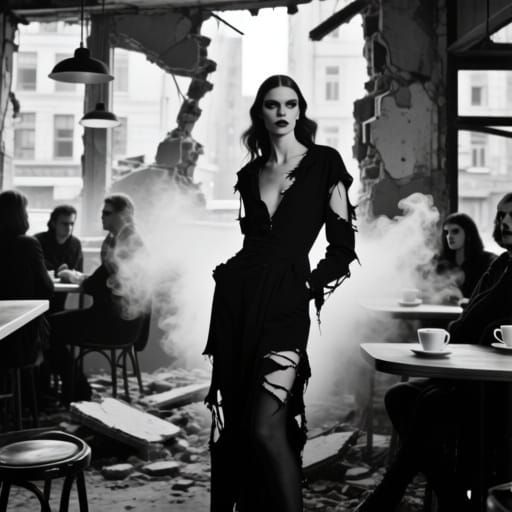 This black and white photo captures a fashion model in a gritty urban coffee shop made of rubble. Goth patrons and ethereal smoke add to the dramatic, high-contrast film noir atmosphere.