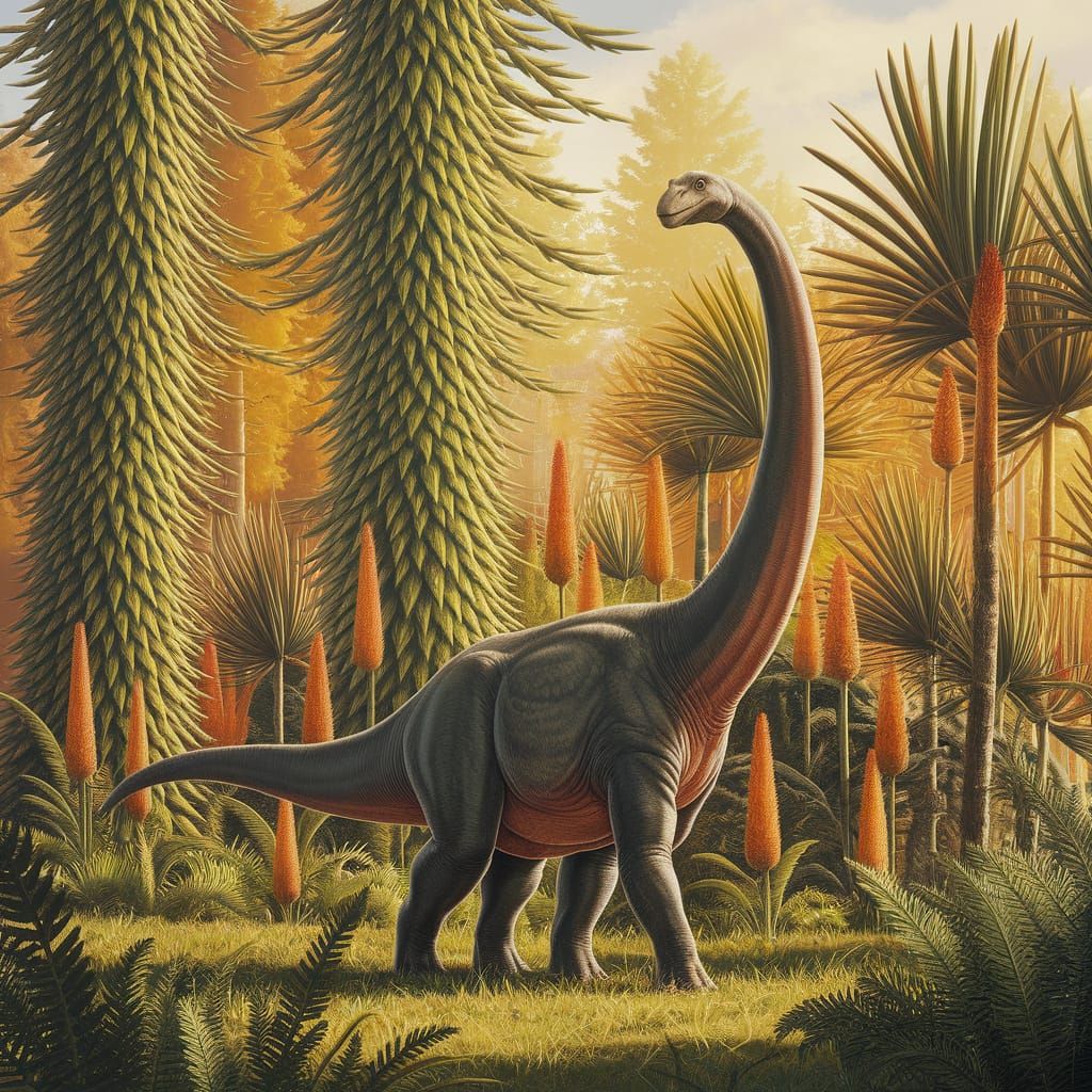 A serene oil painting of a brachiosaurus in a prehistoric forest with cycads, ginkgos, and ferns. The warm golden light enhances the peaceful scene in this landscape art.