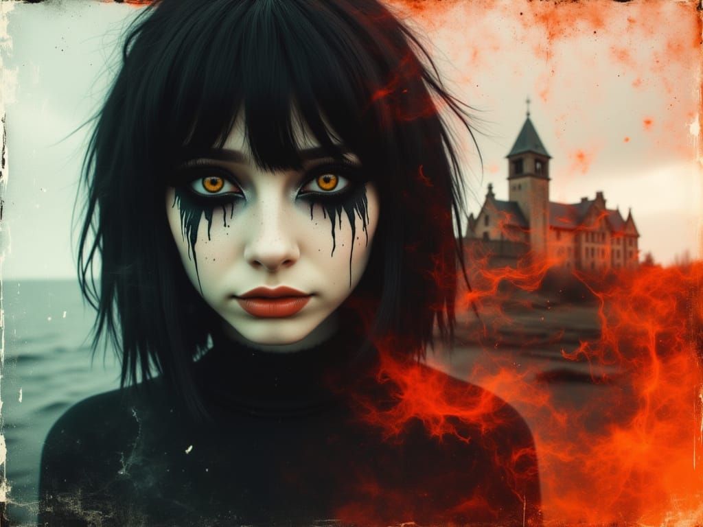 A poignant, metaphorical image of a cyberpunk woman with wet eyes, set against a sad, ruined castle. The scene features double exposure art with amber and red tones, evoking grief and healing.