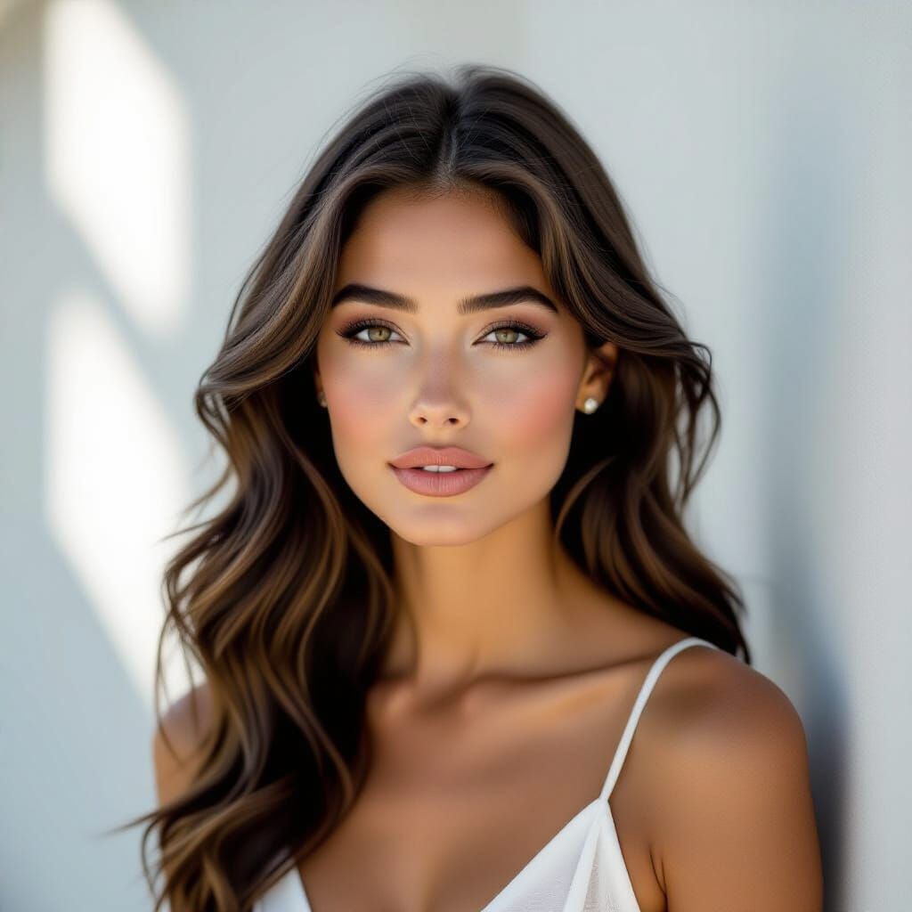 This image captures a charismatic star with elegant makeup and stylish attire, bathed in soft cinematic light. It features subtle shadows, realistic reflections, and a blurred pastel background, showcasing extreme detail and an immersive depth of field.