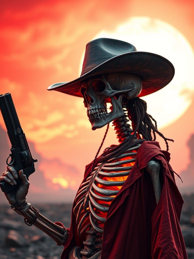 A striking picture of a skeletal cowgirl's face and upper body in a post-apocalyptic desert. The image features hyper-realistic textures, cinematic haze, and a gritty, surreal aesthetic.