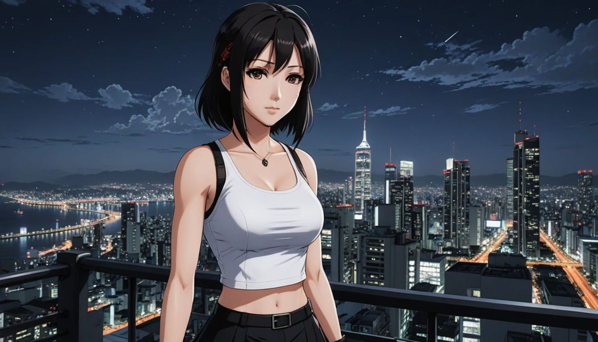 This image depicts a beautiful anime-style girl, reminiscent of a smiling Tifa Lockhart, gazing lovingly at a stunning cityscape by night. She wears a short white tank top and black skirt, with high heels and long black hair, set against a backdrop of a skyscraper's terrace overlooking the sea.