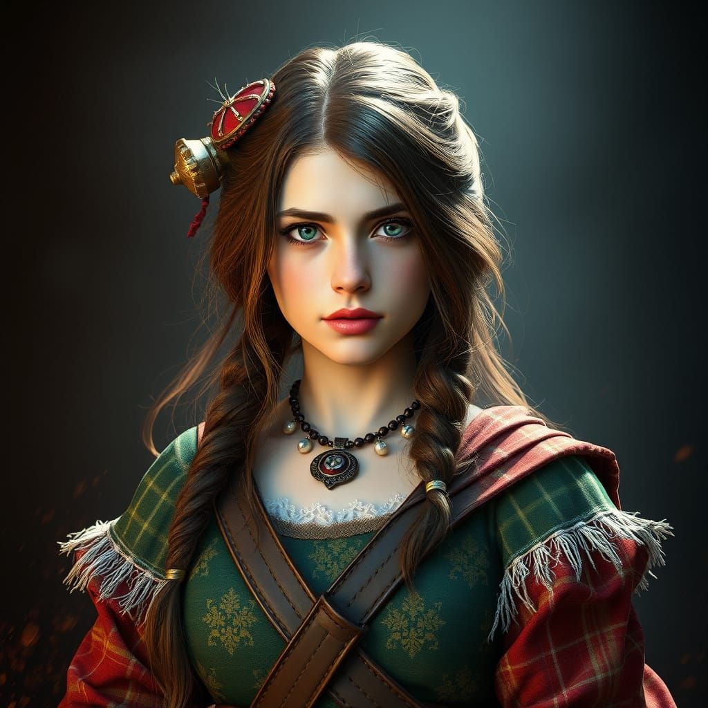 A detailed portrait of a girl in traditional Scottish Highland dress. The image features dynamic lighting and intricate details, rendered with vivid colors and high resolution to create a stunning artwork.
