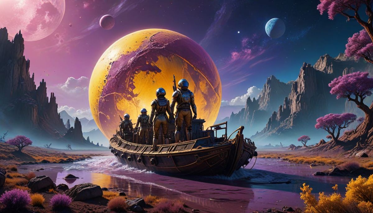 A striking picture of a surreal sci-fi landscape with figures in space suits on a boat amidst a misty forest. Vivid yellow and steampunk elements create a cinematic, high-contrast scene with a triadic color scheme.