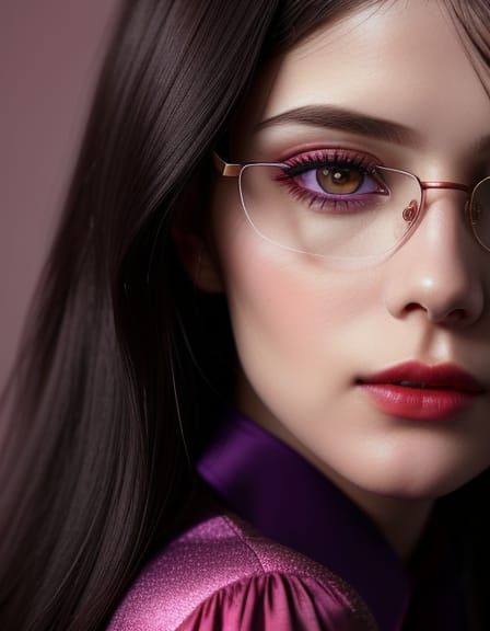 A stunning portrait of a young woman with dark hair and pale skin, set against a soft, natural light background. Delicate features and vibrant red eyes are captured in high detail, with a focus on feminine beauty and high-end fashion.