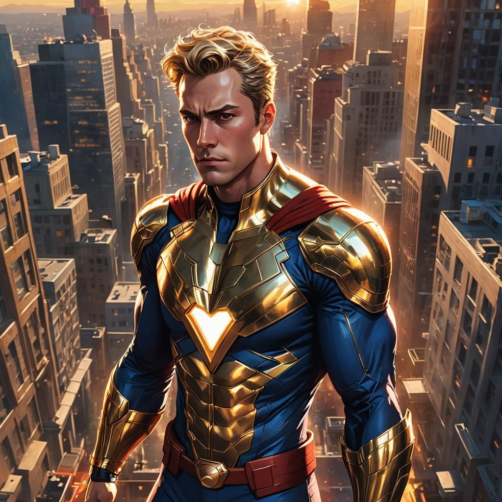 This vibrant anime portrait captures a heroic figure standing tall in a cityscape, illuminated by the warm tones of golden hour, with cinematic lighting and elevated angles creating a sense of drama and intensity.