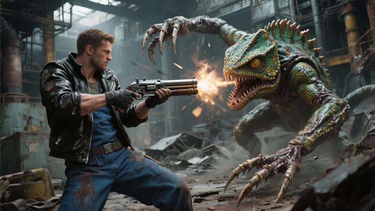 This image depicts a determined vault dweller in a leather jacket and jumpsuit battling a massive, mutated chameleon creature with huge claws in a ruined factory. The scene captures a desperate struggle for survival in a gritty, post-apocalyptic setting with desaturated colors.