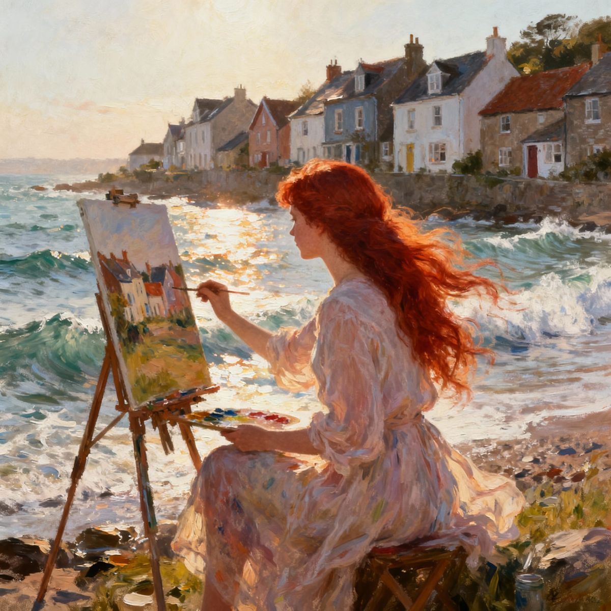 This image shows a woman painting seaside houses in soft morning light. Gentle waves and warm sunlight create a peaceful scene with rich brushstrokes and vibrant colors.
