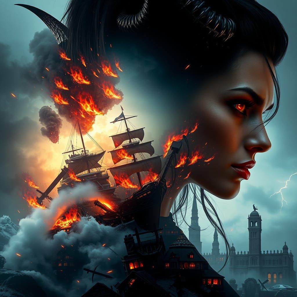 A dramatic double exposure showing a supervillain in profile. The silhouette reveals burning cities and stormy seas, embodying destruction in a dark fantasy aesthetic with dynamic lighting.