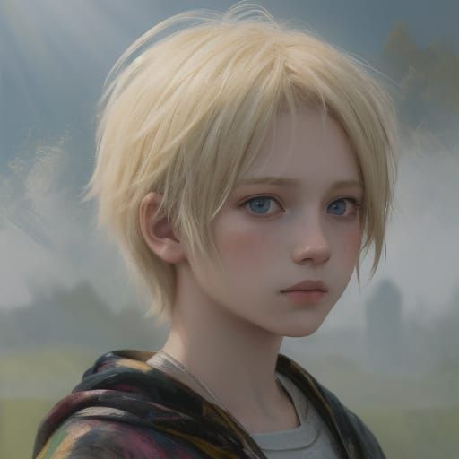 A vibrant watercolor portrait of a blond-haired boy. The image showcases a neo-impressionistic style with thick layers of colorful, textured paint, reminiscent of impasto techniques.