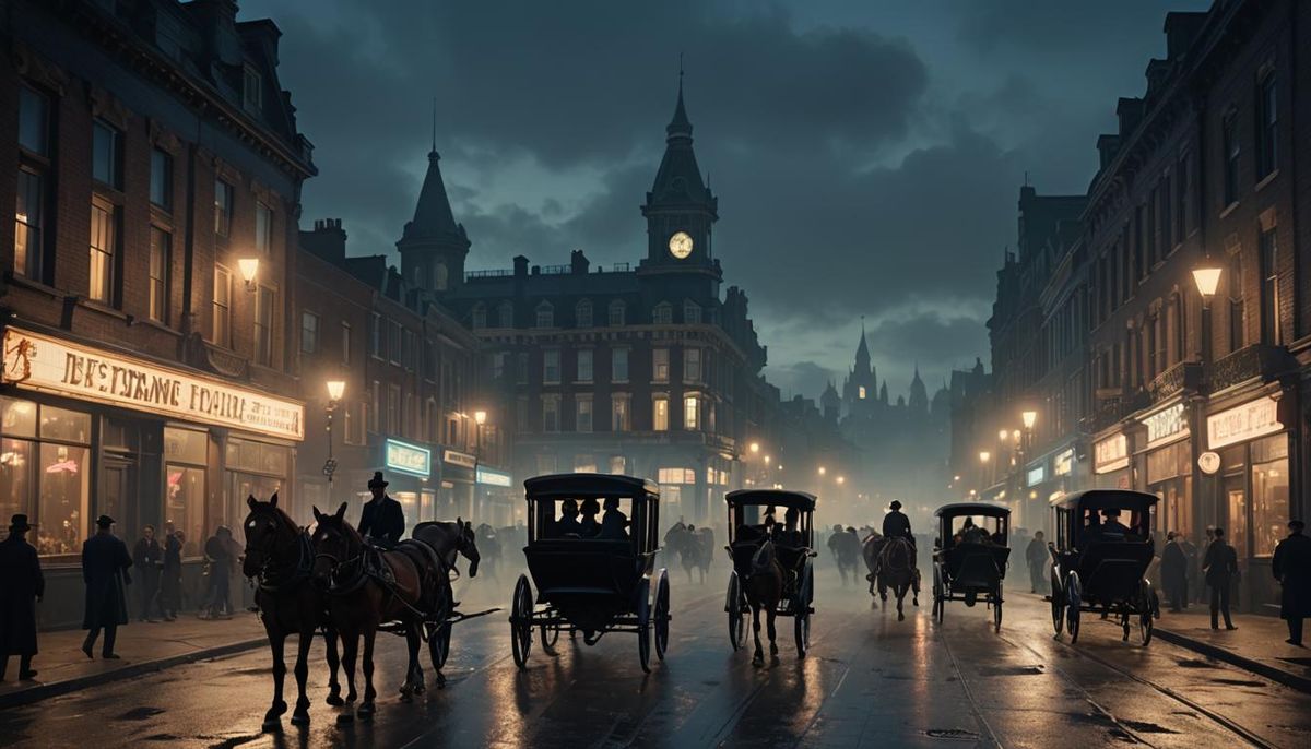 A nighttime cityscape featuring Victorian-era architecture and neon-lit nightclubs. The scene includes horse carts, pedestrians, and a detective observing from a nearby building, all rendered with detailed textures and cinematic lighting.