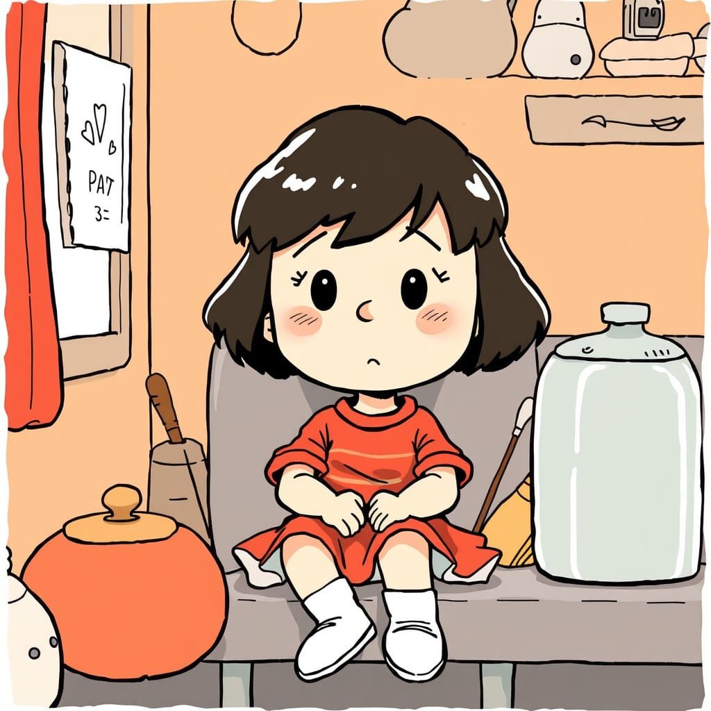 This image depicts a young girl, Mafalda, in a simple and expressive drawing style reminiscent of Quino's iconic cartoons, surrounded by everyday objects, with a mix of influences from Hergé, Bill Watterson, and Will Eisner.
