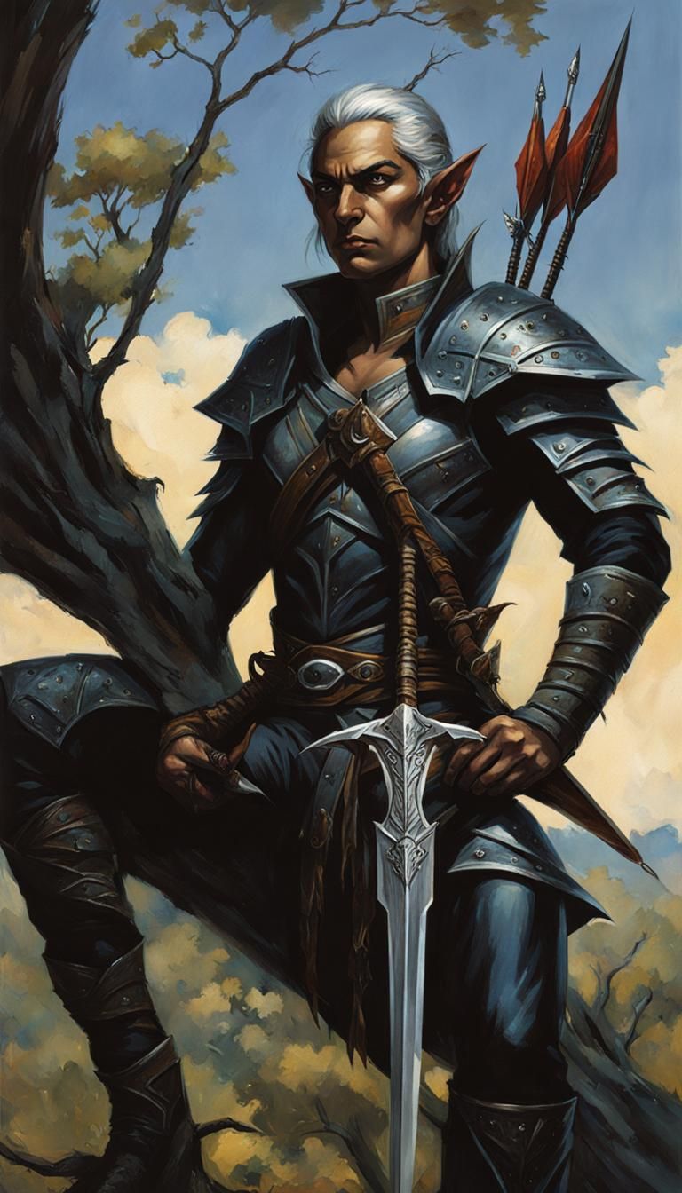 A dark elf sits in a tree, armed with hunting knives and a bow, observing wyverns soaring in the sky. The image has a sinister aesthetic.