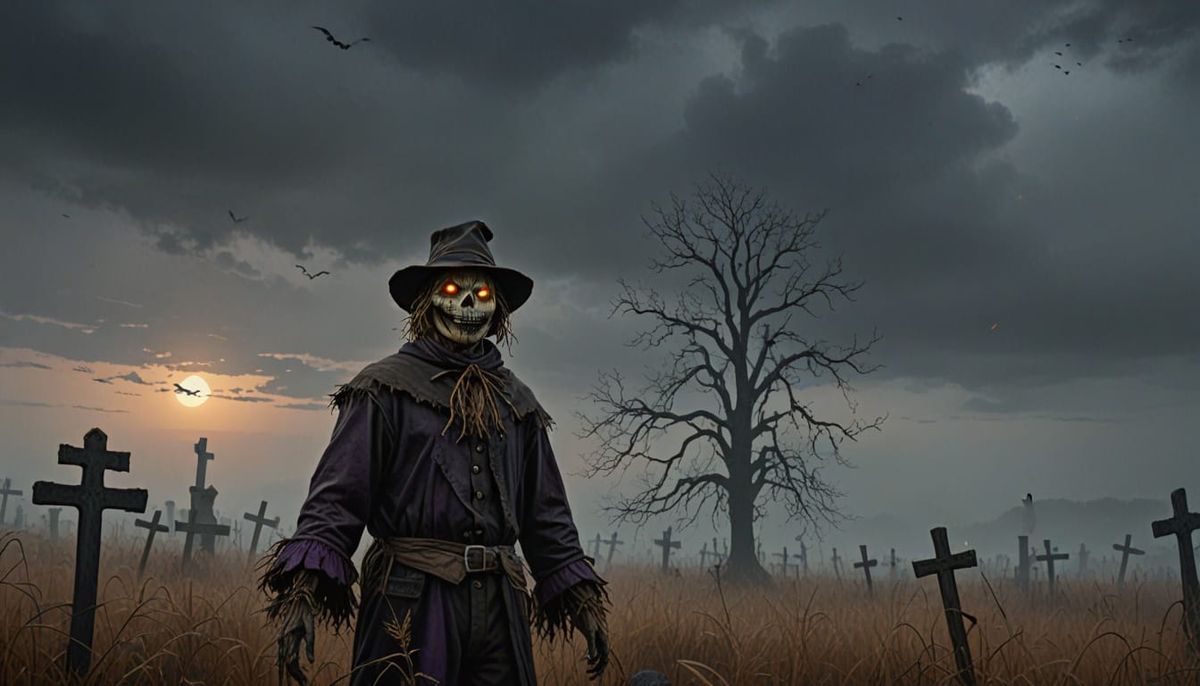 This image shows a spooky scarecrow in a misty field on Halloween night, rendered as an oil painting with eerie glowing eyes and tattered clothes. Features a deep purple and orange palette with atmospheric lighting.