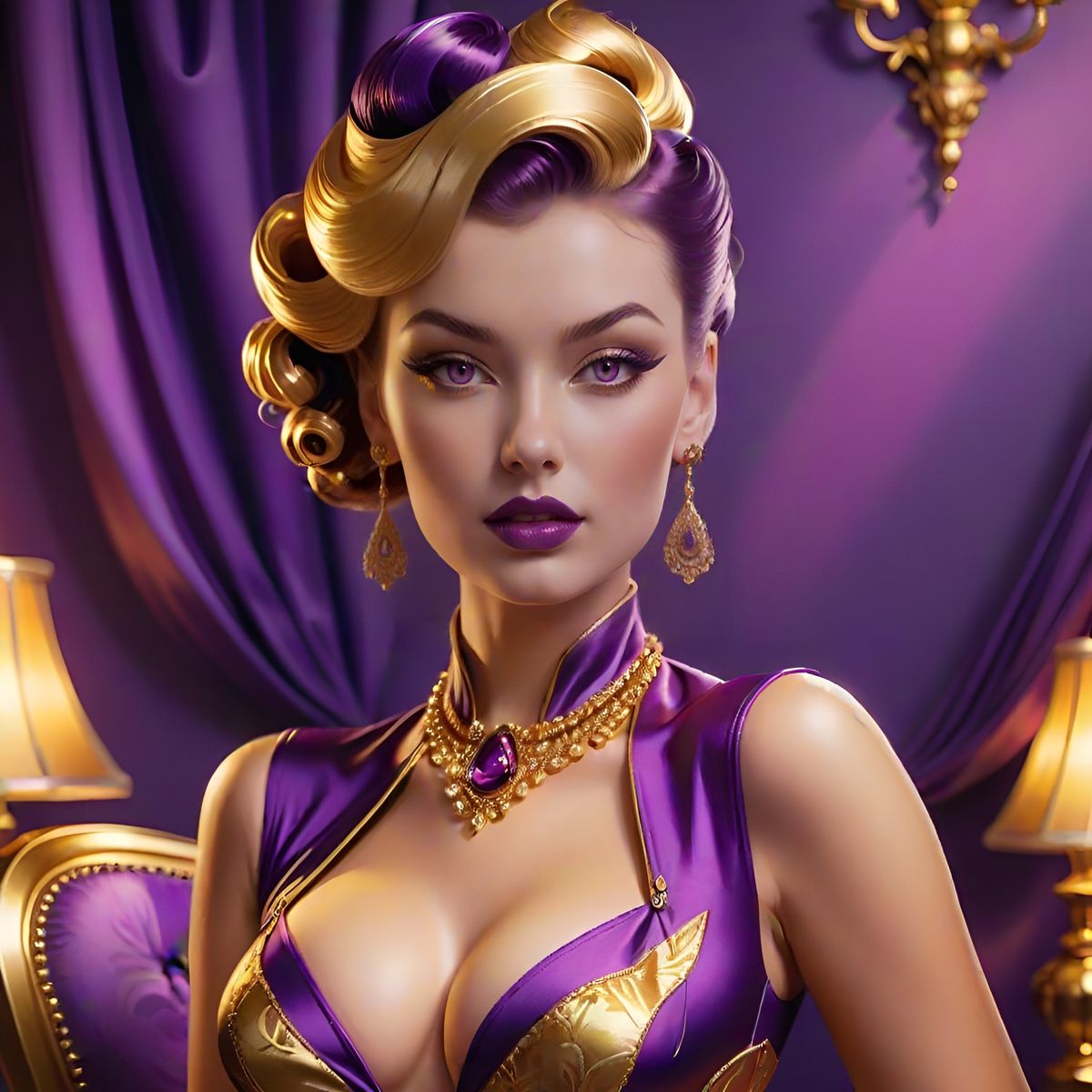 This image shows a stunning pin-up model in a luxurious purple and gold atmosphere, with bright warm lighting and an opulent setting.