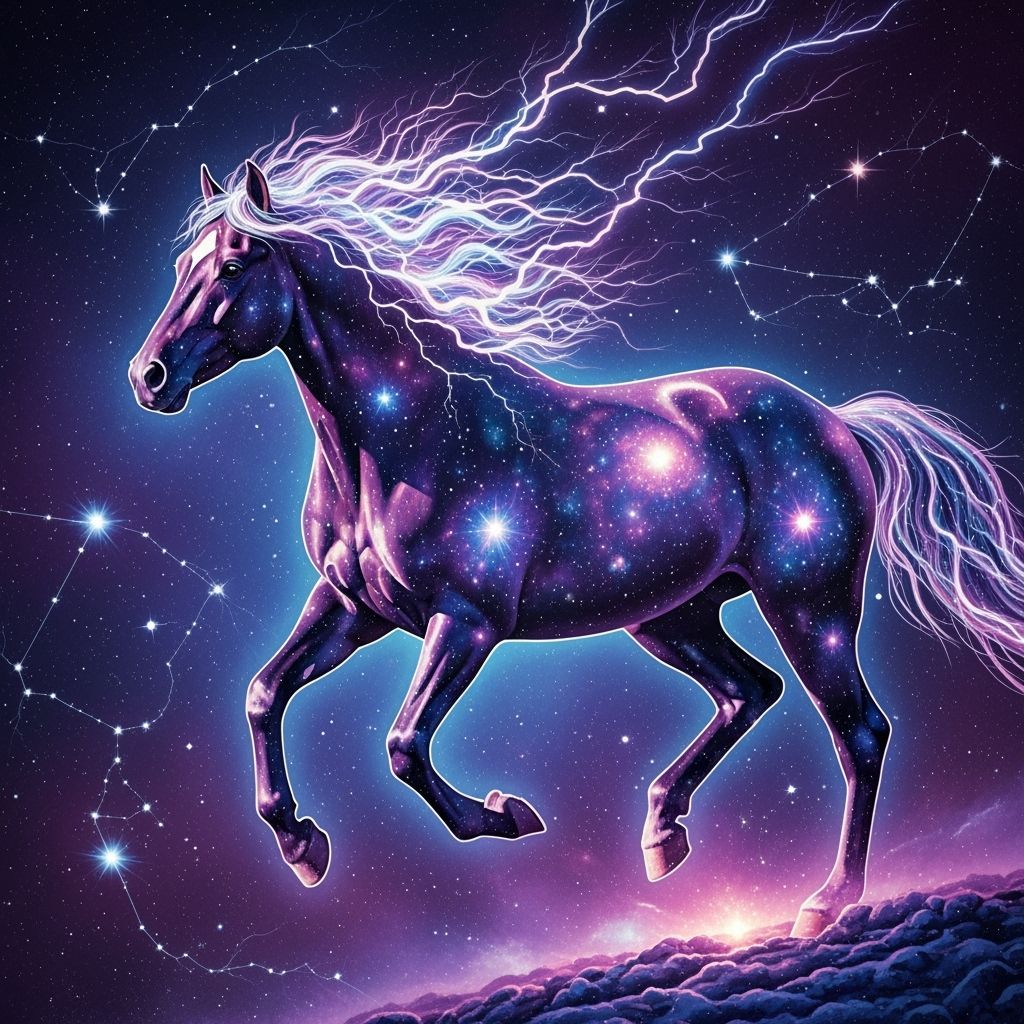 A striking picture of a horse galloping through a constellation. The horse is depicted in shades of purple and blue, with a mane of lightning and a body covered in glowing galactic fractals, in a psychedelic mixed-media style.