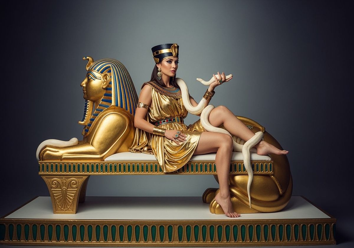 A captivating image of an Egyptian queen in a gold toga, lounging on a sphinx-shaped chaise lounge. The photo, with bokeh and sharp focus, captures the scene's opulence and her interaction with a white snake.