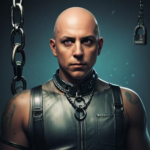This image depicts a handsome, muscular man in an orange jumpsuit chained to prison bars. The hyperrealistic digital artwork uses dramatic lighting and a vibrant color palette.