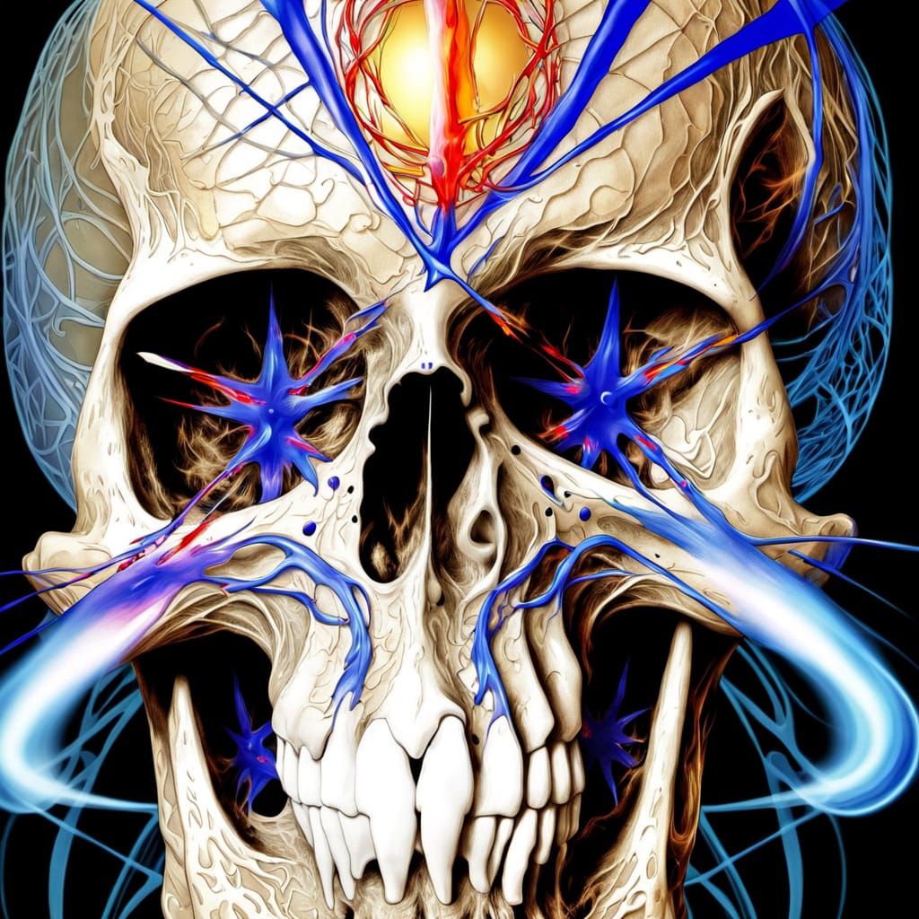 This image showcases a stunning, hyper-realistic digital art portrait of a skull, featuring intricate details, radiant eyes, and a rich, greenish background with warm, golden lighting.