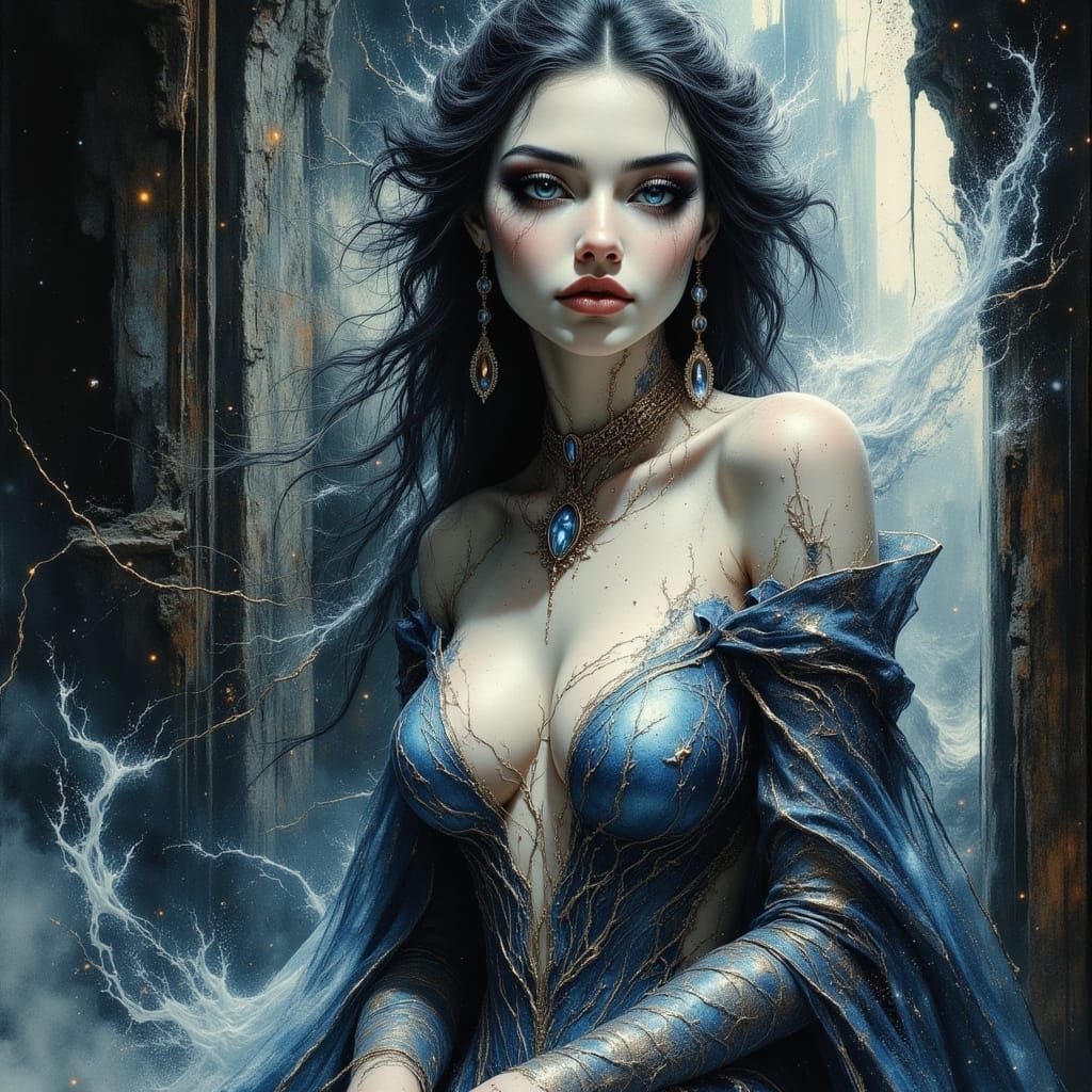 A detailed ink drawing of a celestial goddess shrouded in mist and fractal patterns, presiding over a spectral castle in a dark, gothic, surreal style.