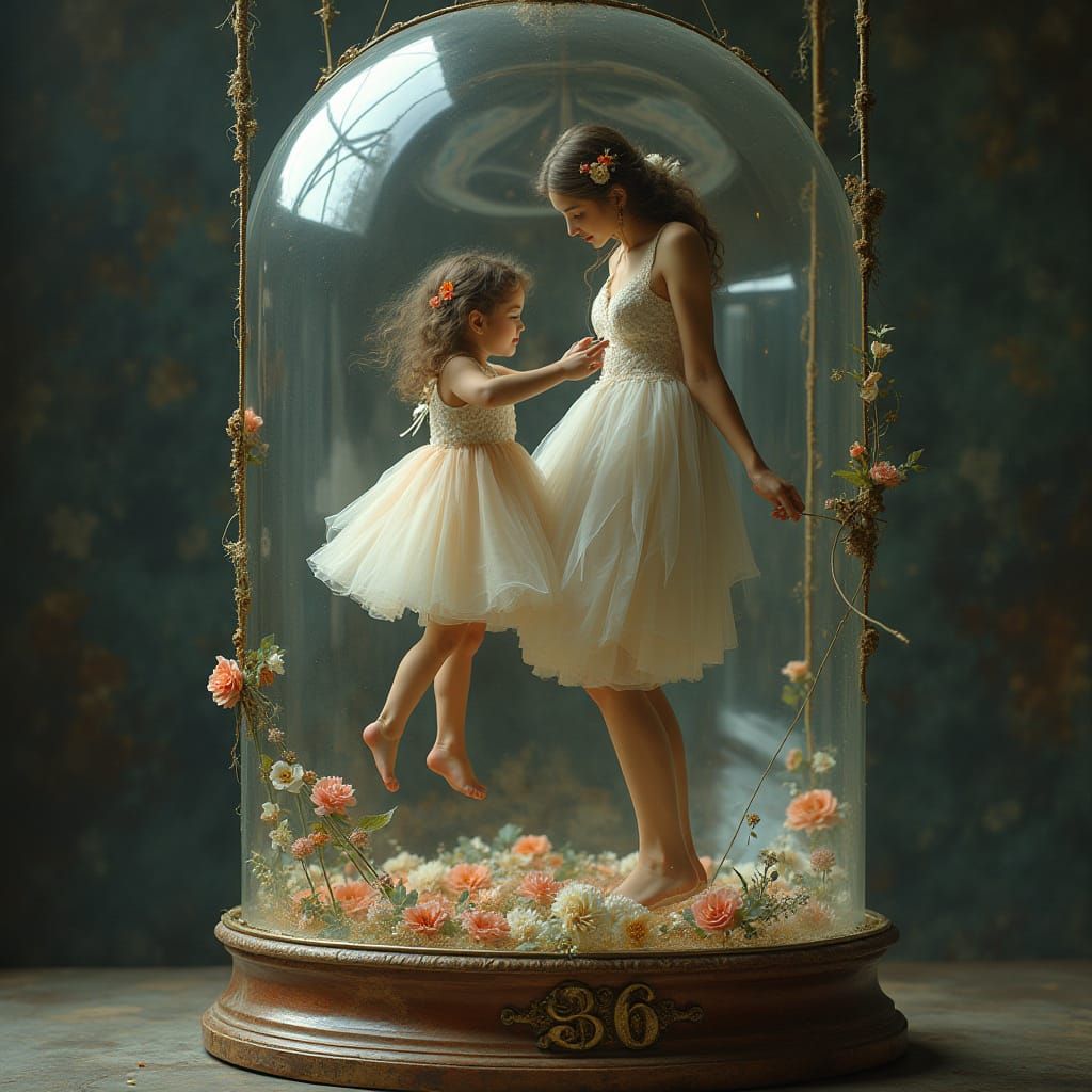 Uma linda mãe com seu bebê de 3 anos surreal numa corda bamba e várias cores dentro de uma grande ampulheta com uma torneira jorrando pétalas em caracóis com um Objeto esferico antigo com a inscrição "86" tendo como Inspiracao o estilo de Jean-Léon Gérôme