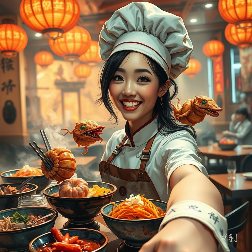 This captivating image combines futuristic concept art with whimsical illustrations, set in a vibrant dining room where a Chinese woman creates mutated food creations with an excited grin, surrounded by exotic ingredients and sizzling dishes, with bold brushstrokes and intricate textures, blending fantas...