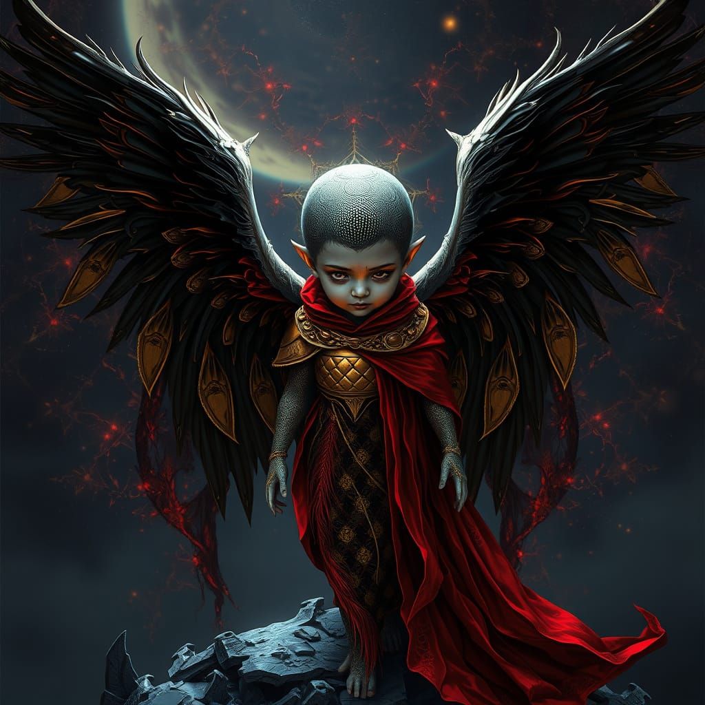 This image shows a mystical figure with black wings, a golden shell, and a long, blood-red coat, shining in the night with intricate fractal patterns and 3D shading, evoking a sense of futuristic mysticism.