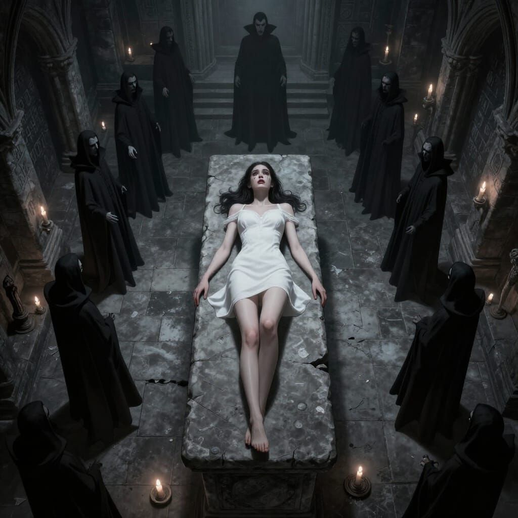 A woman in a white dress is on a stone altar in an ancient crypt, surrounded by vampires. Her expression shows fear and fragility, captured from a top-down, symmetrical perspective.