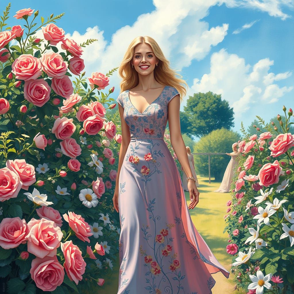 This image shows a beautiful, smiling woman in a delicate floral dress, walking through a stunning garden filled with blooming roses and flowers, set against a bright blue sky with fluffy white clouds.