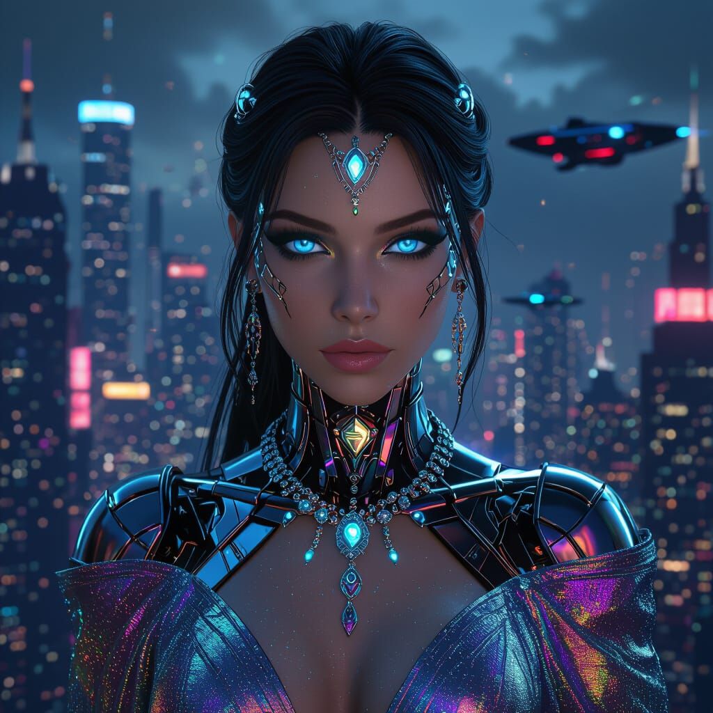 This image shows a beautiful cyborg woman with glowing eyes in a futuristic cityscape. She is wearing jewelry and an iridescent gown, rendered with high detail in a digital art style.