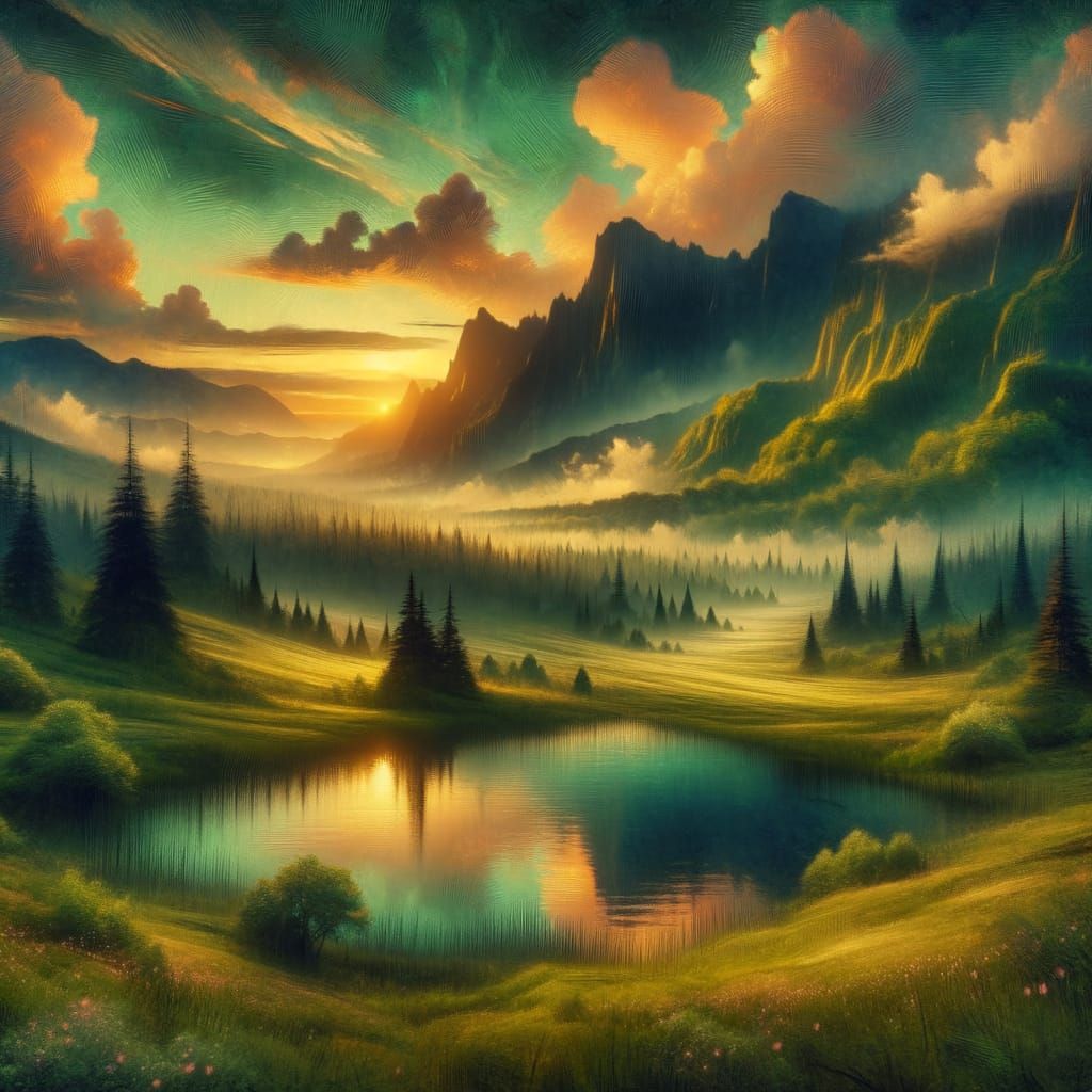 A cinematic digital painting of a misty Black Forest landscape. Majestic green mountains are reflected in a still pond. The image captures a dreamy, atmospheric scene with intricate details.