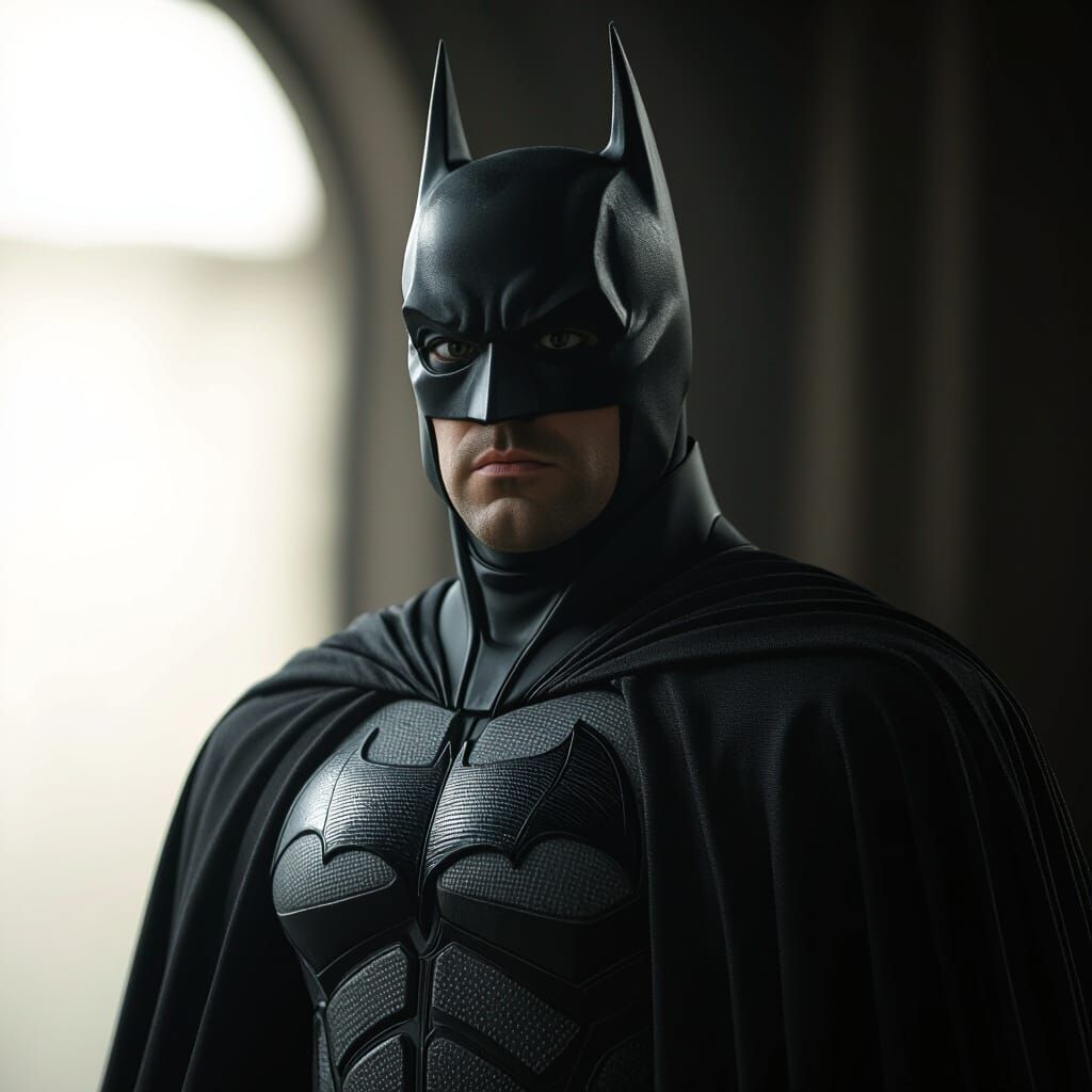This image shows Batman cloaked in black, captured in a cinematic still. The scene features film grain and vignette effects, enhanced by post-processing and cinematic lighting, reminiscent of live-action film.