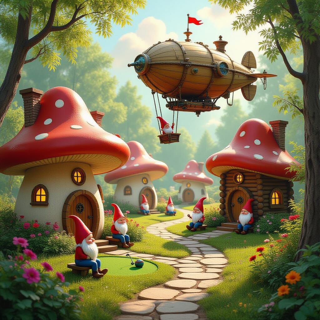 This image shows a whimsical gnome village nestled among vibrant flora. Gnomes play and relax in mushroom homes and log cabins, while a steampunk-inspired airship floats above, rendered with warm lighting and soft textures.