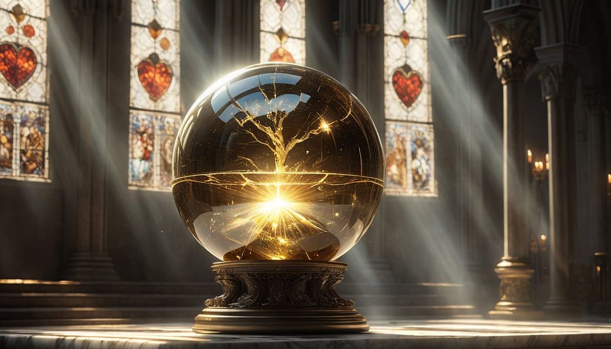 This image shows a radiant golden crystal sphere with a heart shape pulsating inside. It floats above a marble pedestal in a sunlit cathedral, with rays of light streaming through stained glass.