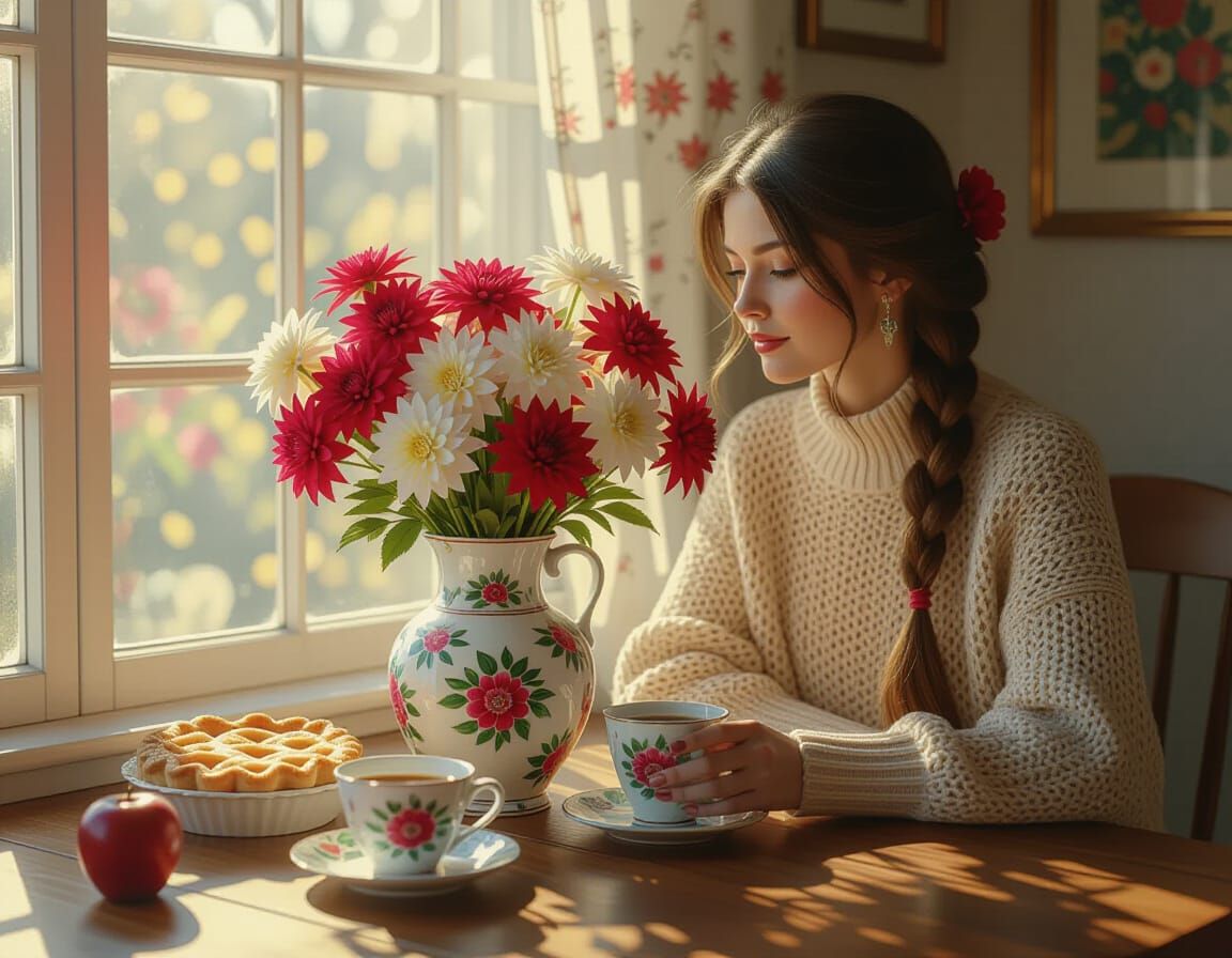 This image shows a woman on a sunlit porch with a large dahlia bouquet. A hyperrealistic 3D scene featuring coffee, pie, and mountain ash is rendered with bokeh and dramatic colors.
