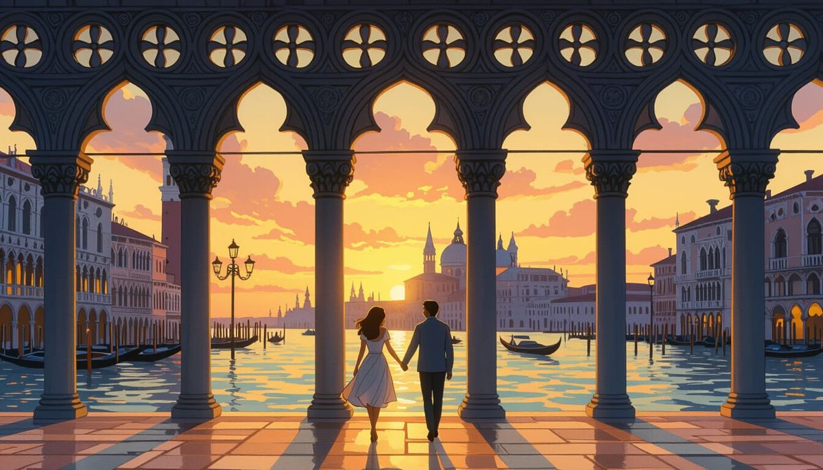 This image features a romantic couple walking in St. Mark's Square at sunset, with a canal view. Rendered in soft watercolor hues with a whimsical feel, reminiscent of vintage animation.