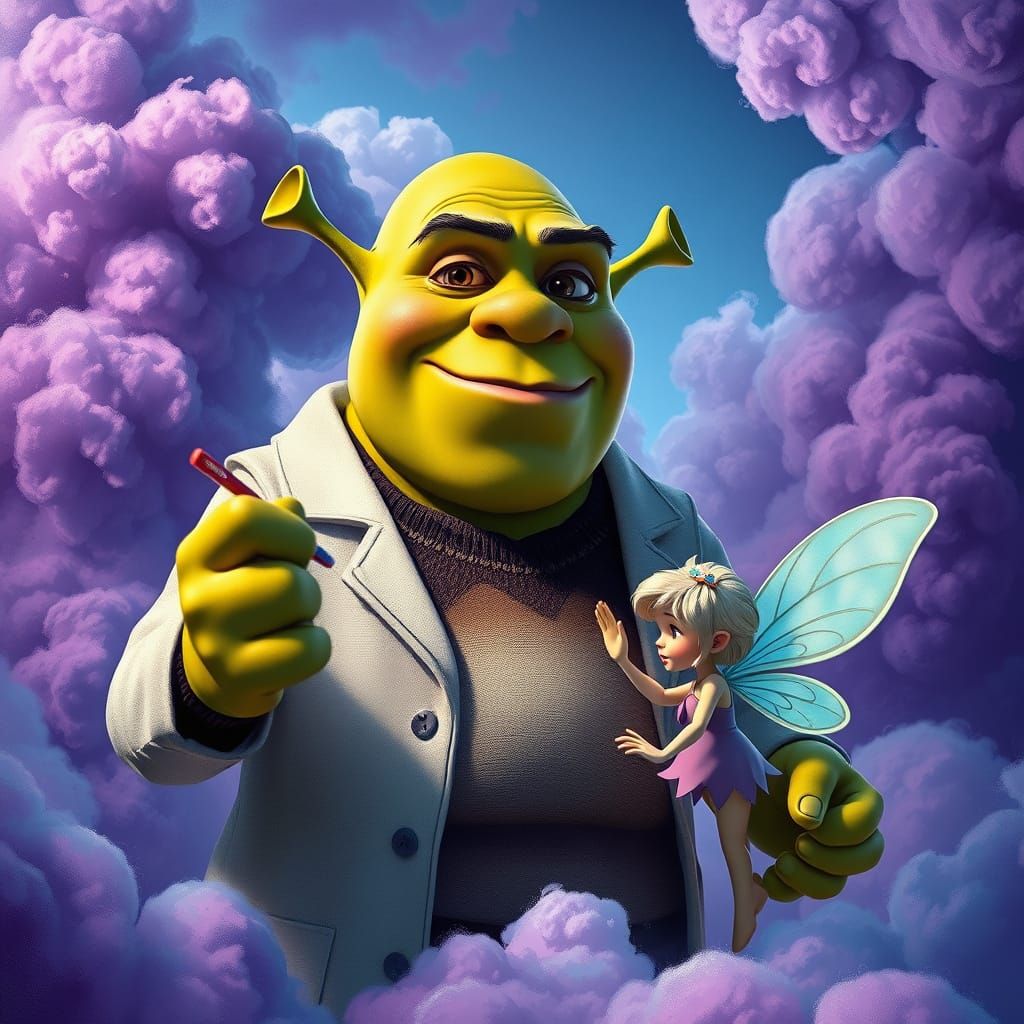 This fantastical scene depicts Shrek as a dentist, towering over a whimsical tooth fairy in a dreamlike landscape with intricate textures and delicate details, reminiscent of concept art from a beloved animated film.