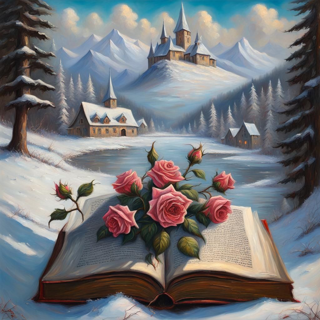 This image shows an ancient open book with frozen roses growing inside, set against a backdrop of a winter village and snow-capped mountains. Rendered as an oil painting.