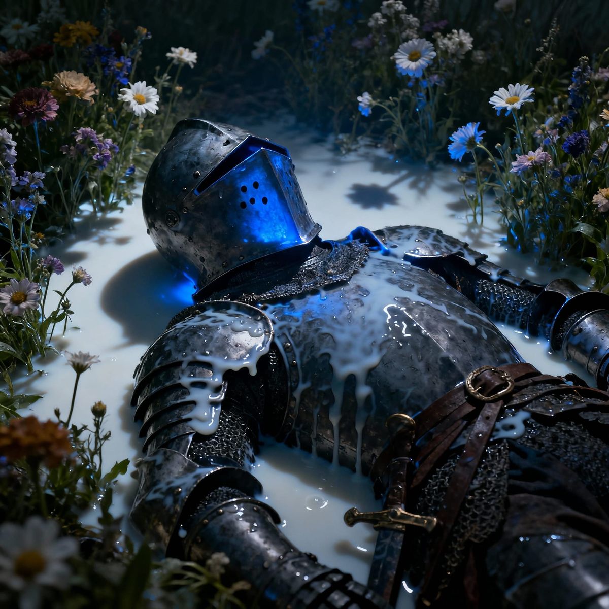This image depicts a knight in a flower field, bathed in an eerie blue light. The artwork features a unique, textured liquid effect and dramatic, cinematic lighting.