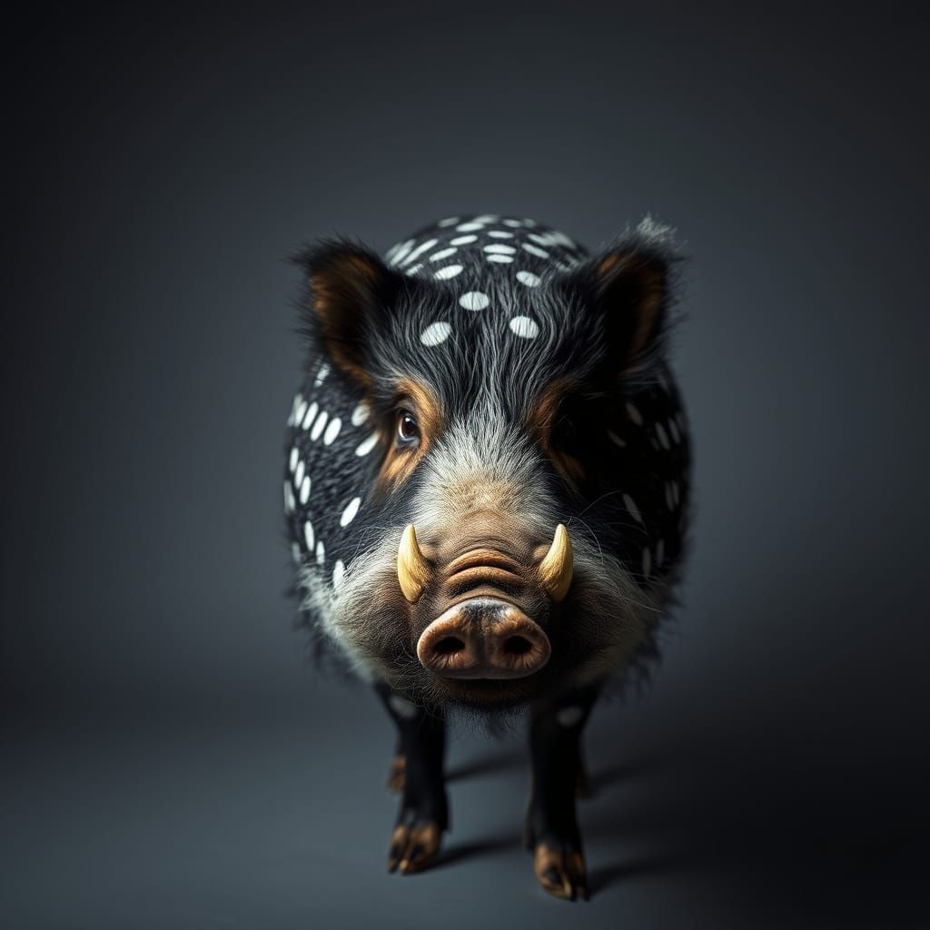 This image shows a minimalist portrait of a woolly wild boar with white polka dots on its fur, set against a grey background with a fall aesthetic in a pointillism style.