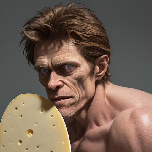 This image shows Willem Dafoe eating cheese in a hyperrealistic style. Dramatic lighting and intricate details enhance the colorful and menacing scene.