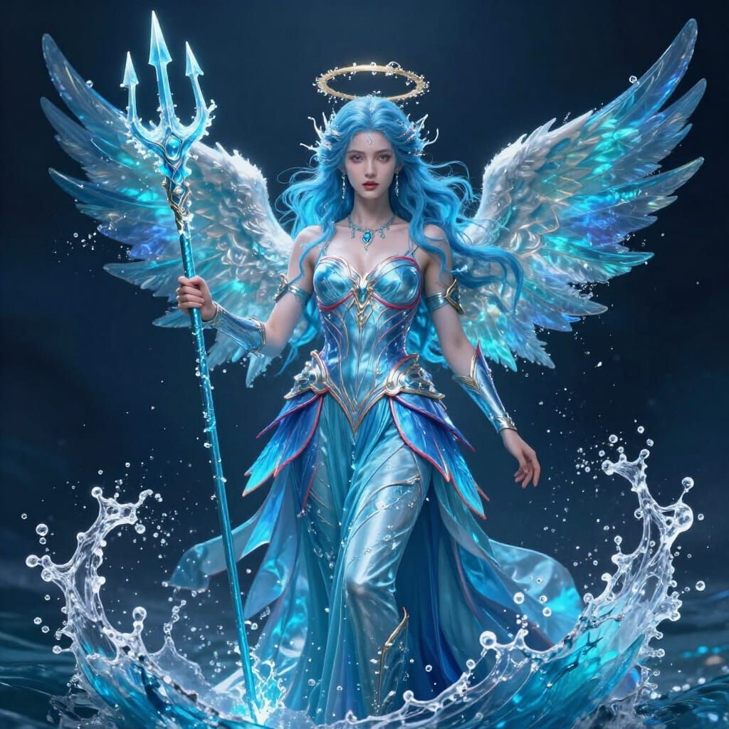 This image features an Oceanic Goddess with flowing water hair, water wings, and a trident. Rendered in a fantasy concept art style with deep colors and dramatic lighting.