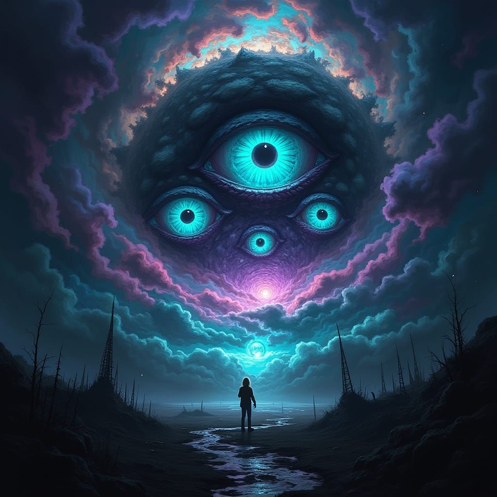 A dark, mystical scene with glowing eldritch eyes emerging from vibrant, swirling psychedelic skies, evoking an ominous, dreamlike atmosphere.