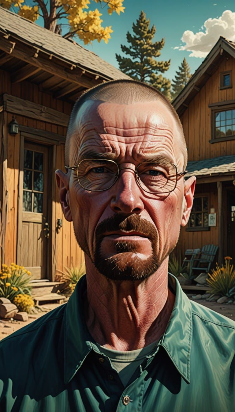 This image depicts Walter White, a drug dealer from Breaking Bad, concealing himself in a cottage to evade law enforcement. Rendered in a hyperrealistic, splash art style with intricate detail and dramatic lighting.