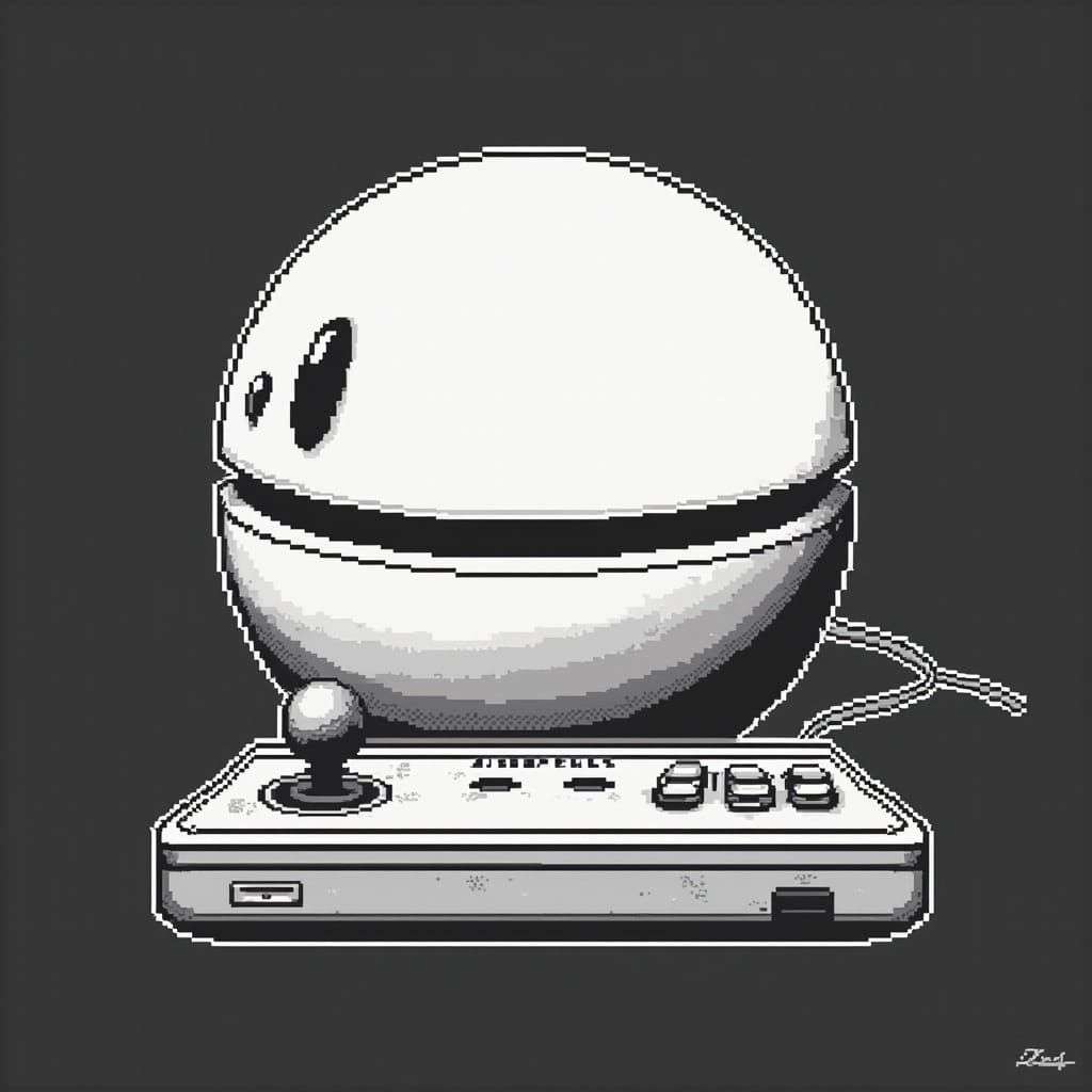 This image shows a minimalist black and white pixel art design. It combines elements of Dragon Ball, Star Wars, and retro gaming in an iconic 8-bit aesthetic with bold lines and high contrast.